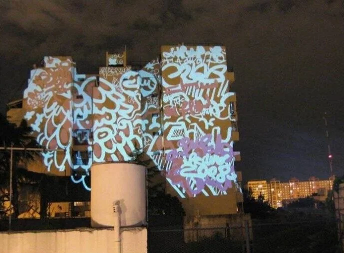 So, while traditional graffiti artists redefine and rework public spaces for themselves, This Is Not Graffiti showcases my ability as a photographer and animator to claim ownership over their artwork. Because graffiti works are public, they become my property when I photograph them. By assembling these images into an animation and projecting them on the CMB building, I redefine and rework the work of these graffiti artists into my own artwork. In displacing the territory from which they originate by relocating them to my place of preference, I generate authority over the graffiti artists themselves, staking a claim in the space of their own artwork. This Is Not Graffiti, in turn, is not just an experiment in graffiti practice and light projection, but also a performance that both highlights and diminishes the powers graffiti artists grant themselves through their practice.
